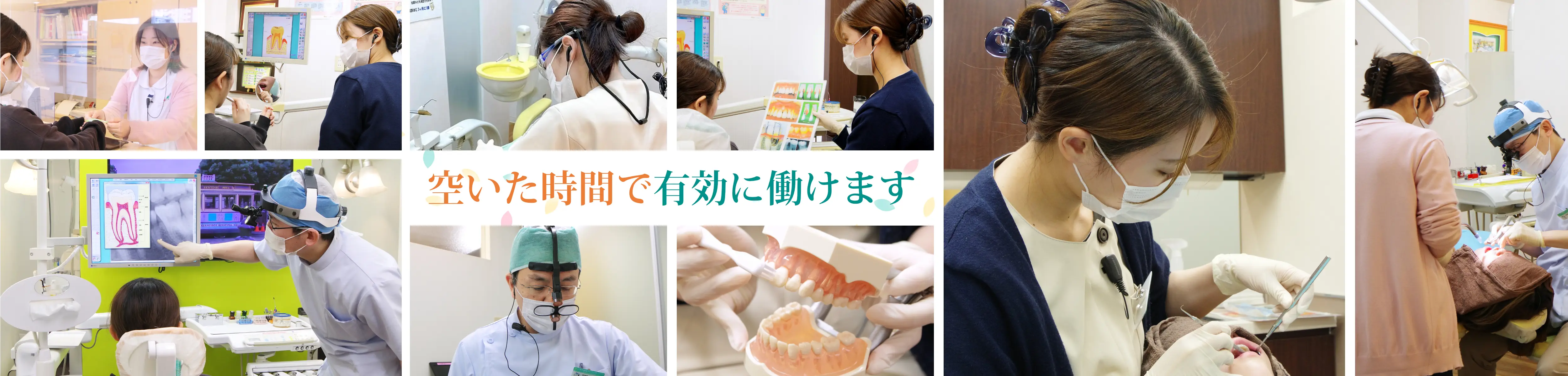 例えば、本人の希望や勤務実績を踏まえて、勤務時間の調整や各種機関(歯科衛生士専門学校)と連携し、働きながら歯科衛生士へのキャリアアップをサポートすることができます。